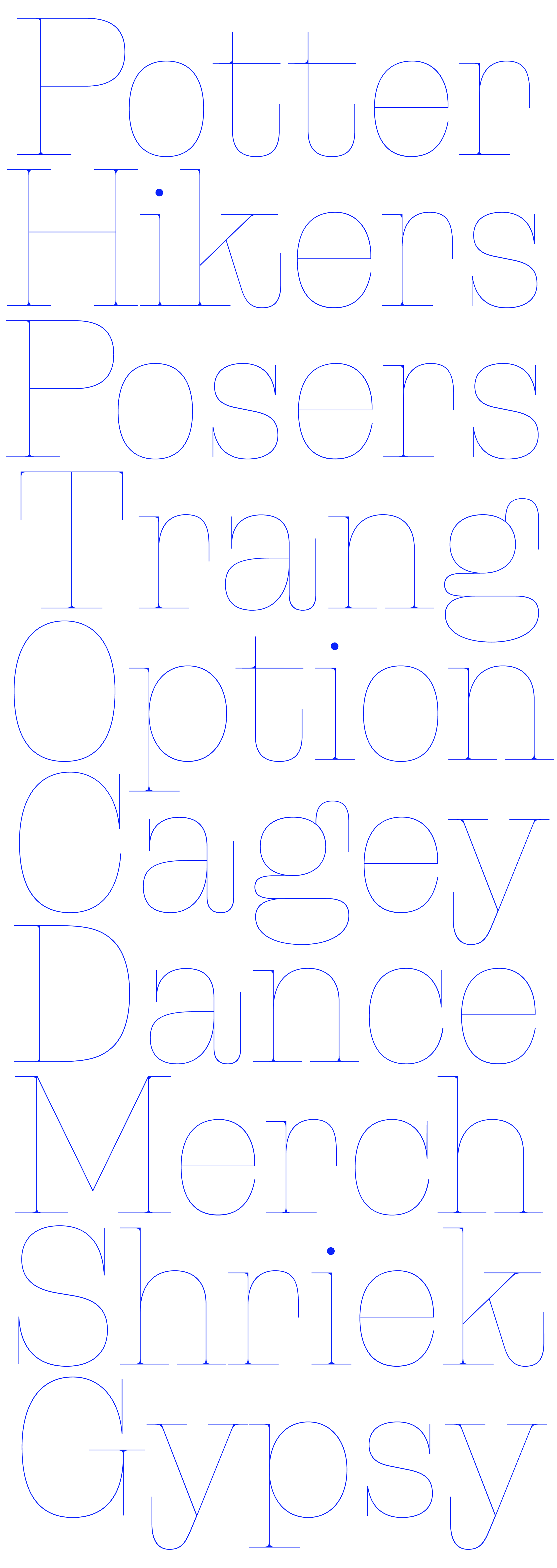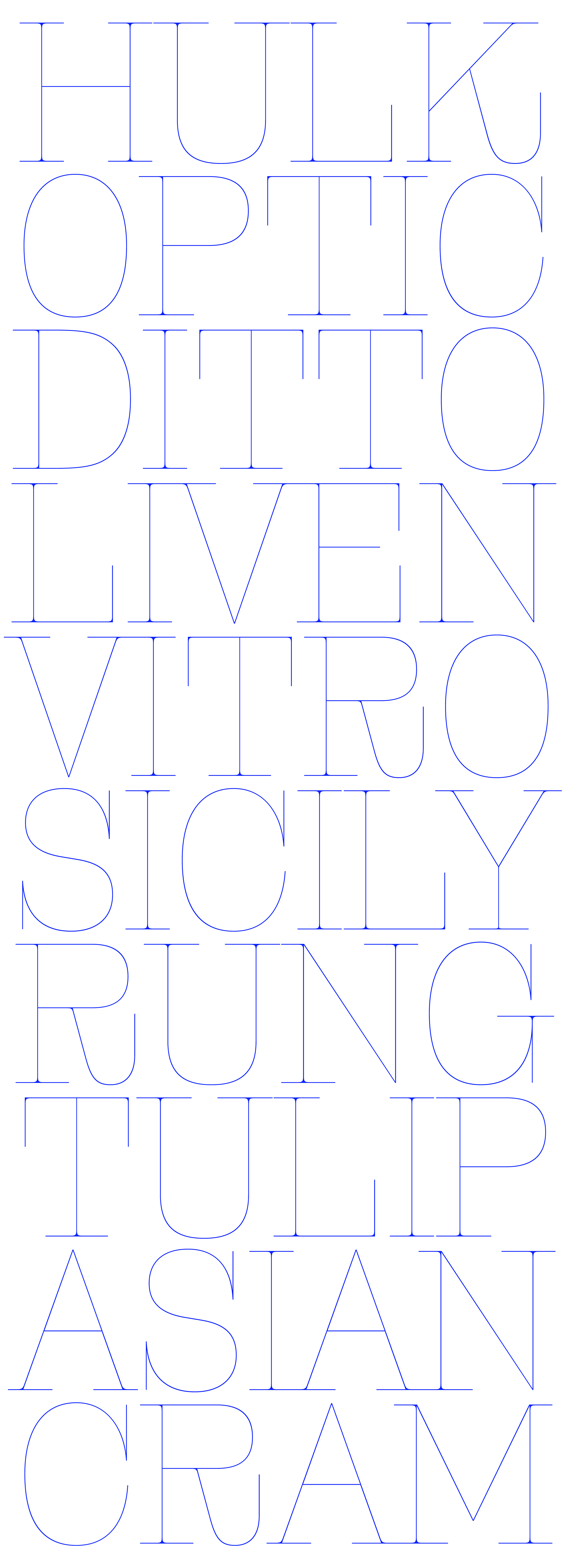 All the flesh has been carved away, leaving only the wiry, chic skeleton of the letterforms. The result is a typeface ready to bring elegance and subtle sophistication to any design.